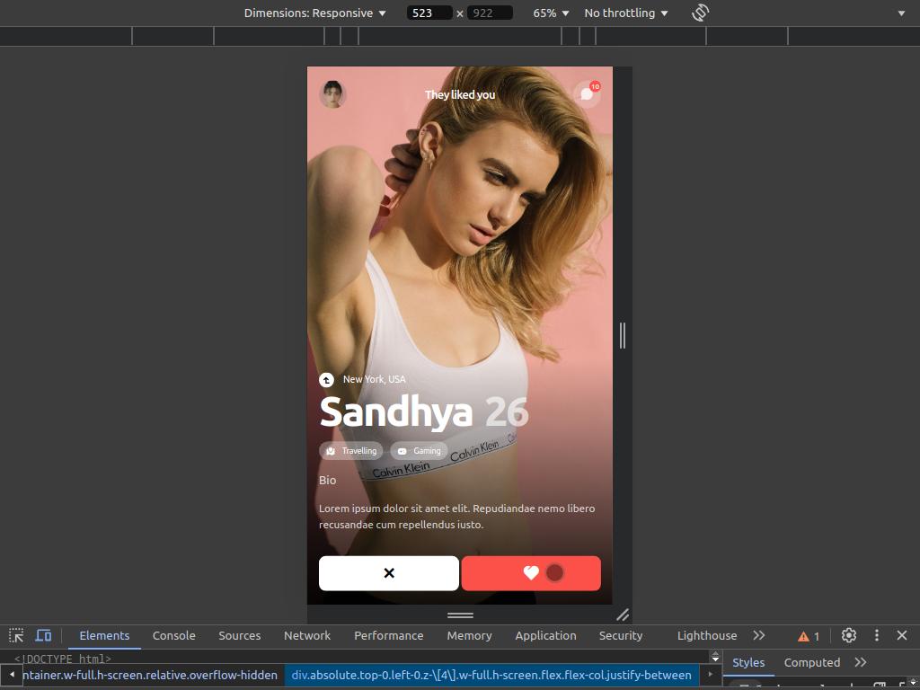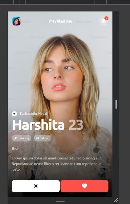 This project is about creating a tinder web effect.Also, while viewing this page don't forget to set your borwser width according to mobile devices or, its good if you are viewing in mobile.